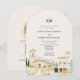 Celebrate your wedding in the heart of the Italian countryside with this elegant Tuscany destination wedding invitation. This romantic design features a graceful arched layout paired with a watercolor illustration of a charming Tuscan village landscape with vineyards, historic buildings and rolling hills.
