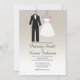 Une faire-part de mariage simple et tendance avec un arrière - plan dégradé neutre, avec un smoking et une robe mariage.