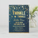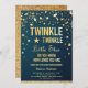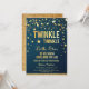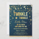 Éblouissez vos invités avec cet invitation de baby shower à thème étoiles mignon avec des étoiles d'or et la typographie moderne contre un arrière - plan de galaxie bleue. Ajoutez simplement les détails de votre événement sur ce modèle facile à utiliser pour en faire une invitation unique. Retournez la carte pour révéler une fausse texture de parties scintillant d'or au dos de la carte.