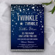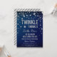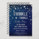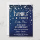 Éblouissez vos invités avec cet invitation de baby shower à thème étoiles mignon avec des étoiles d'argent et la typographie moderne contre un arrière - plan de galaxie bleu foncé. Ajoutez simplement les détails de votre événement sur ce modèle facile à utiliser pour en faire une invitation unique. Retournez la carte pour révéler un faux motif de bandes de parties scintillant argent au dos de la carte.