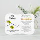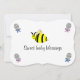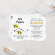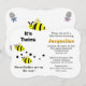 It's Twins in black typography. Two yellow black striped bumble bees with black dots. Sweet babies are on the way. Personalize mom-to-be name in orange yellow, and event details in black. Backside has bumble bee, and pink and blue baby rattles. Sweet Baby Blessings is written in black script. Original Artwork and Design by TamiraZDesigns.