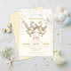 Watercolor birthday invitation featuring two dancing geese for boy-and-girl twins. The female wears a dusty pink crown and coquette bow with balloons, the male wears a blue crown and bow with a trumpet bursting confetti. Set against a soft light beige gingham background, rendered in gentle pastel watercolor style. Vintage nursery charm perfect for a twins’ birthday celebration.