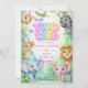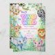 This adorable Party Animals Birthday Invitation is filled with rainbow sparkle and the cutest safari friends wearing party hats.
