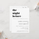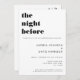 Donnez le ton de votre célébration avec cette invitation à dîner de répétition moderne, avec une typographie audacieuse en noir et blanc et une élégance minimaliste. Parfait pour votre mariage "La nuit avant", ce design élégant convient à des événements formels, contemporains ou à cravate noire. Facile à customiser avec vos détails mariages.