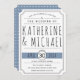 Cette élégante invitation de mariage à la mode billet présente un design moderne de typographie noir et blanc. Ajoutant une touche de sophistication, l'invitation est magnifiquement accentuée par une douce couleur bleu poussiéreux. Les noms du couple sont artistiquement présentés dans une typographie fantaisiste dessinée à la main, ce qui crée un charmant contraste avec l'arrière - plan blanc. Pour souligner le jour spécial, la date du mariage est affichée sur une bannière bleue élégante. Il y a aussi une bordure noire avec des coins inversés autour. Au fond de l'invitation, une motif géométrique captivante avec des croix blanches sur fond bleu apporte une touche contemporaine.