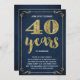 Cette invitation de fête d'anniversaire de mariage élégante et chic présente une typographie vintage, des fioritures élégantes, une calligraphie au pinceau, un faux papier métallisé doré et un fond bleu marine chic.