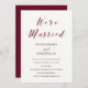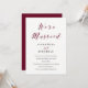Cette invitation de fête après mariage présente une calligraphie couleur marsala / bourgogne ainsi que du texte noir moderne, sur un fond blanc élégant.