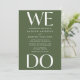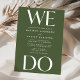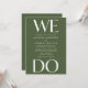 Élevez l'anticipation de votre jour spécial avec notre invitation de mariage moderne "We Do" – un mélange saisissant de lettrage blanc gras sur fond vert olive. Positionnée en haut et en bas, la phrase "We Do" fait une déclaration visuelle puissante, symbolisant votre union. La beauté réside dans la personnalisation au centre, où vous pouvez ajouter vos noms et les détails du mariage, rendant cette invitation unique. Choisissez entre des invitations imprimées de haute qualité, une option de téléchargement instantané pour un accès immédiat, ou optez pour les deux pour profiter du meilleur des deux mondes. Faites une déclaration avec style et préparez le terrain pour votre histoire d'amour – achetez l'invitation "We Do" maintenant et commencez votre voyage vers un début magnifiquement conçu.