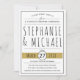 Typographie moderne noir et blanc mariage invitation de douche couple accentué avec l'or. Il présente votre texte en noir sur blanc et la date de votre wedding shower sur une bannière en or. Il y a une bordure noire autour. Le dos comprend un motif avec des croix blanches de couleur or.