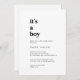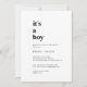 Cette typographie noire moderne c'est une invitation de baby shower garçon est parfait pour un baby shower simple. Le design minimaliste noir et blanc présente une police rétro mais contemporaine, avec une atmosphère bohème rustique unique. Parfait pour toute saison. Gardez-le minimal, en l'état, ou ajoutez vos propres graphiques et illustrations.