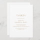 Cette invitation à la fête du 30e anniversaire de la typographie or chic est parfaite pour une fête d'anniversaire moderne. Le design simple présente une typographie classique minimaliste d'or et de blanc, dans un style boho rustique. Personnalisable dans n'importe quelle couleur. Gardez le design minimal et élégant, en l'état, ou personnalisez-le en ajoutant vos propres graphiques et artwork.