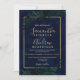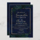 Une typographie dorée moderne, chic et élégante Floral green Noël mariage d'hiver invitation avec feuillage en feuille d'aquarelle vert peint à la main sur couleur bleu marine.
