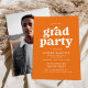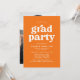 Cartes d'invitation de fête de remise de diplômes élégantes avec "fête de diplômés" en caractères gras blancs et le nom du diplômé ainsi que les détails de la fête en dessous sur fond orange. Le verso de l'invitation de la fête de remise de diplômes orange présente la photo verticale du diplômé. Les invitations simples pour la fête de remise de diplômes sont parfaites pour les diplômés du lycée et de l'université.