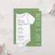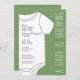 Un thème amusant de douche à couple - Un bébé est en train de brasser! Cette invitation baby shower comprend un mignon t-shirt bébé avec arrière - plan vert et police calligraphie moderne pour les noms des parents à être. Ajoutez l'information sur la future maman avec les informations du parti et où la nouvelle mère est inscrite pour les cadeaux. Ce tee-shirt surdimensionné contient toutes les informations de la fête. Un simple motif à points polka se trouve à l'arrière.