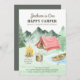 Un Happy Camper première invitation anniversaire avec la scène de camping aquarelle. Le design comprend un camp au bord du lac avec tente, feu de camp, morses et forêt de montagne.