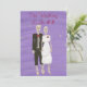 Pour un mariage d'Halloween amusant, profitez de ma jolie peinture d'un couple de squelettes ; le marié porte un smoking noir avec une cravate arc-en-ciel rouge et la mariée porte une robe mariage blanche avec une fleur rouge. Le design est imprimé sur les invitations de mariage que vous pouvez facilement personnaliser sur les formulaires modèles. Merci pour faire les courses CherylsArt sur Zazzle.