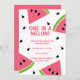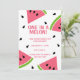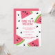Un dans une invitation à la fête d'anniversaire de Melon, bien que le texte puisse être modifié pour n'importe quel anniversaire ou baby shower d'année. Images de pastèque rose et vert vif en été, avec embellissement de graines de pastèque.