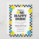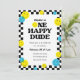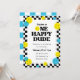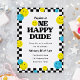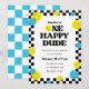 Une invitation ludique et éclatante à la fête du 1er anniversaire avec des icônes de visage jaunes et bleues, et une bordure à damiers noire. "Un mec heureux" est dans une police super et rétro. Si vous souhaitez modifier ce texte, veuillez me contacter et je ferai des mises à jour sans frais supplémentaires. Le dos de la carte est doté d'un motif à damiers bleu et blanc qui convient à l'ambiance rétro. Toutes les couleurs sont modifiables !