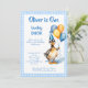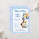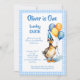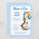 Un canard chanceux bleu en vichy 1er anniversaire invitation éditable modèle instantané téléchargement numérique, mallard canard mallard mignon avec un casquette de fête et ballons avec douce pastel bleu en vichy bordure pour garçons 1er anniversaire invitation