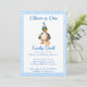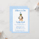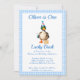 Un canard chanceux bleu en vichy 1er anniversaire invitation éditable modèle instantané téléchargement numérique, mallard mallard mallard mallard mallard mallard mallard avec un casquette de fête un gâteau et une bougie avec pastel bleu en vichy bordure douce pour garçons 1er anniversaire invitation