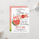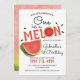 Modern One in a Melon Birthday Party invitation, avec un design contemporain d'une pastèque, des graines de pastèque, le texte "notre petite bonté est" et un modèle d'anniversaire qui est facile à customiser.
