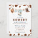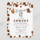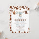 Cette adorable invitation présente une aquarelle représentant des vêtements de cowboy du bébé accrochés à une ligne de vêtements, dont un casquette de cowboy, un bib, un pyjama avec imprimé de vache, une sucette et des bottes de cowboy.La ligne de vêtements est contre un arrière - plan blanc avec des taches de vache brune en haut et en bas. Si vous avez besoin d'un autre produit ou d'une autre personnalisation, veuillez me contacter.