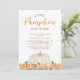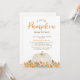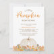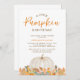 Cette charmante invitation au baby shower présente une belle aquarelle illustrant un citrouille au feuillage automnal. On peut y lire "Un petit Citrouille est en route" dans la typographie stylisée. Parfait pour célébrer l'arrivée prochaine d'un petit en automne. Aquarelle originale © Michele Davies.