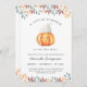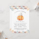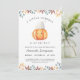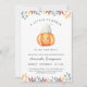 "Un petit citrouille est en route". Célébrez avec ce citrouille de dessins animés sur le thème du baby shower ! Aquarelle caricature kawaii citrouille avec casquette d'automne (casquette) et feuilles d'automne. Au verso de la carte se trouvent les feuilles d'automne.