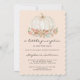 Un petit citrouille est en route ! Cette mignonne invitation au baby shower d'automne présente un citrouille d'aquarelle et un feuillage sur un arrière - plan beige pâle aux bords pétoncles. Facile à personnaliser. Aquarelle originale © Michele Davies.