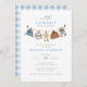 Invitation de baby shower rustique cowboy pour un bébé avec un thème occidental adorable avec des illustrations aquarelle de vêtements de bébé accrochés à une corde, y compris des bottes de cowboy, denim, flannel, et une minuscule veste frangée. Le design combine des tons doux bronze et bleu avec une typographie ludique mais élégante qui met en valeur le titre "A Little Cowboy is on the Way" dans un charmant script et mélange serif. Le dos affiche un bleu bébé classique en vichy à damiers motif, ajoutant de la chaleur et de l'air de pays. Parfait pour les baby showers de campagne, les célébrations sur le thème de l'Ouest et les rassemblements en plein air, cette invitation offre une façon chaleureuse et élégante de célébrer l'arrivée prochaine d'un petit cowboy. Disponible sous forme de cartes imprimées ou en téléchargement numérique instantané.