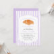 Célébrez votre petite fille sucrée avec cette invitation baby shower "A Little Croissant Is On Her Way" dans une douce lavande violette colorée. Ce design est composé d'un croissant d'aquarelle peint à la main, d'un script élégant et de rayures violettes pastel, pour un style cosy et d'inspiration parisienne. Un choix qui plaira à une boulangerie, un brunch ou un baby shower à thème français. Personnalisez avec vos détails d'événement pour une célébration élégante et mémorable.