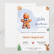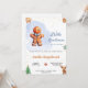 Une invitation à un baby shower à thème festif. Les caractéristiques du design : Un homme en pain d'épice à l'expression joyeuse, décoré de glace blanche, une cravate arc bleu, et des boutons en glace blanche. L'arrière - plan derrière l'homme en pain d'épices est un lave-linge bleu doux. ### Décorations : - **Bordures et accents : *** - Petites étoiles en pain d'épice et biscuits éparpillés autour des bords. - Un biscuit décoré dans l'arbre de Noël en bas à droite. - Divers biscuits de pain d'épices, dont une étoile en haut à gauche, un coeur en haut à droite, et un renne en bas à droite. ### Couleurs et style : - **Couleur : *** arrière - plan principalement blanc avec accents de bleu, d'orange et de marron. Les biscuits en pain d'épices ajoutent une teinte brune chaude, tandis que les décorations incorporent des couleurs festives comme le vert et l'or. - **Style de police : *** Un mélange de polices cursives et de polices de blocs, avec un sentiment ludique et festif approprié pour un baby shower avec un thème de pain d'épices. Dans l'ensemble, l'invitation dégage une atmosphère chaleureuse et festive, célébrant l'arrivée prochaine d'un petit garçon sur le thème de l'homme en pain d'épices.