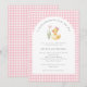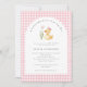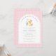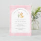 Un petit canard est sur le chemin Duck Baby shower Invitation - avec un petit canard bébé assis à côté des fleurs roses et portant un arc coquette rose. L'invitation est entourée d'adorables en vichy rose vif à la typographie moderne pour une atmosphère minimaliste. L'invitation fait partie d'une collection de Baby showers.