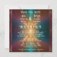 La pièce maîtresse de l'invitation est une étoile éblouissante, rayonnant du centre dans un harmonieux mélange de bleu étincelant et de jaune doré. Le design vibrant capte la brillance des étoiles, avec des rayons bleus scintillants s'étirant vers l'extérieur, fusionnant doucement avec des accents jaunes dorés lumineux. Chaque faisceau de lumière s'efface élégamment au fur et à mesure qu'il s'étend, créant une lueur éthérée qui danse à travers la page. Des détails délicats et scintillants parsèment l'ensemble, comme de minuscules étoiles ou des points de lumière diamant, renforçant l'atmosphère radiante et festive de l'invitation. L'ensemble est à la fois fascinant et élégant, donnant à l'invitation une sensation céleste et festive.