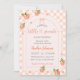 Accueillez votre petite princesse ou prince avec style avec notre invitation de baby shower pour bébé, petite pêche sucrée. Cette invitation présente des pêches et des fleurs à l'aquarelle sur un fond à carreaux pêche clair. Le thème parfait pour un baby shower neutre, pêche ou inspiré du printemps ou de l'été.