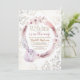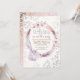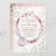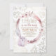 Cartons d'invitation pour une Baby Shower 'C'est une fille' avec une couronne de fleurs mauves et roses pastel à l'aquarelle et un petit lapin adorable.