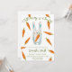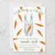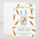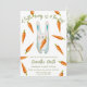 Cartes d'invitation pour une fête prénatale de bébé de genre neutre. Avec la phrase 'UNE PETITE LAPINE EST EN ROUTE !', une illustration d'un lapin (aquarelle) avec une carotte dans les pattes, et de nombreuses carottes de couleur orange. Articles assortis disponibles.