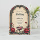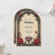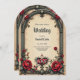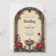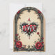Une romance gothique. Un cadre de style gothique orné entourant un arrière - plan beige. Des roses rouges aux feuilles vert foncé sont disposées autour du cadre, particulièrement dans les coins. Au centre inférieur, il y a un emblème décoratif en forme de coeur avec le mot "LOVE" inscrit dans une police stylisée.