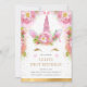 Invitation à la fête d'anniversaire de la licorne. Un design tout à fait mignon en parties scintillant faux or avec des accents floraux. Le rose et l'or sont les couleurs dominantes, parfaites pour une magique fête du 1er anniversaire. Cette invitation rose, or brillant et mignonne peut être personnalisée avec l'inclusion des détails de votre petit.