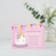 Un mignon gâteau d'anniversaire à la licorne dans la palette de couleurs blanc, rose, bleu et jaune pour une célébration magique pour la fille d'anniversaire ! Décoré avec des drapeaux de bunting dans le même jeu de couleurs. Super pour les filles d'anniversaire ! Sur le dos se trouve un arc-en-ciel de trois couleurs et des nuages. Personnalisez facilement avec les détails de votre fête.