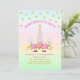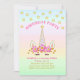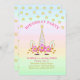Belle licorne, étoiles, fleurs et or look métallique confetti sur tons pastel Carte d'invitation Anniversaire. Tout le texte prêt à être personnalisé.