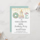 Unicorn First Birthday Party Invitation dans un style lunatique mignon avec parties scintillant en faux or, beigne, lettre florale et gâteau à la licorne. Roses, or et teintes aqua pour une fête d'anniversaire magique. Vert bleu sur le côté arrière de l'invitation. L'arrière de l'invitation en aqua pastel massif. Cette conception a été présentée par Zazzle comme un choix d'éditeur.