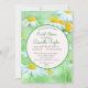 Des marguerites blanches et jaunes contre un arrière - plan vert encadrent un cercle, en vert menthe, pour votre invitation à la douche nuptiale. "Fête des mariées" et le nom de la mariée sont dans la même teinte verte que le cadre et le dos de la carte. Deux polices contrastées, un serif et un script élégant, en combinaison de coque supérieur et inférieur, créent une invitation étonnante.