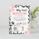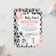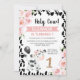 Pink Black Holy Cow Floral Cow Imprimer 1er Anniversaire Invitation Vache mignonne invitation de premier anniversaire pour une petite fille avec une jolie vache noire et blanche, un audacieux motif d'impression de vache, bannière rose et quelques beaux roses floraux roses. Cette invitation de premier anniversaire à la vache rose florale sainte et à la vache noire est idéale pour une fête de premier anniversaire sur le thème de la vache.
