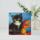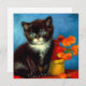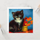 Carte avec un beau chat Van Gogh tuxedo ! Ce petit chaton pose à côté d'un panier de fleurs orange sur une table rouge. Un grand cadeau pour les amoureux de les chats et les collectionneurs d'art hollandais !