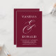 Faire-part de mariage moderne avec un agencement simple et minimal avec vos noms et une élégante esperluette dans un grand format au-dessus de vos détails de l'événement. Le thème de couleur est bordeaux et peut être modifié dans l'outil d'édition de conception.