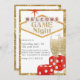 Cette invitation à la soirée de jeu glamour présente un thème glitzy Las Vegas. Une paire de dés de parties scintillant rouge est représentée en bas à droite, avec deux verres de champagne étincelants placés devant les dés. Un panneau de style Bienvenue à Las Vegas est placé en haut avec "Game Night" imprimé sur lui dans une police de parties scintillant dorée. Une bordure de paillettes d'or encadre l'invitation.
