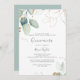 Cette invitation à la verdure et à la feuille d'or Quinceañera est parfaite pour une fête moderne de 15ème anniversaire. L'élégant design botanique présente des eucalyptus aquarellés clairs et aquarellés, agrémentés de feuilles de parties scintillant en or blanc.
