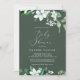 Cette invitation au baby shower vert pour chasseur de bois est parfaite pour un baby shower d'été ou d'automne. Le design boho moderne comprend des feuilles d'eau vert émeraude, sauge et olive luxuriants et des botaniques avec des sprigs de fleurs blanches élégantes.