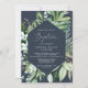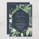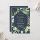 Cette invitation au baptême bleu marine de verdure boisée est parfaite pour un baptême d'été ou d'automne. Le design boho moderne comprend des feuilles d'eau vert émeraude, sauge et olive luxuriants et des botaniques avec des sprigs de fleurs blanches élégantes.